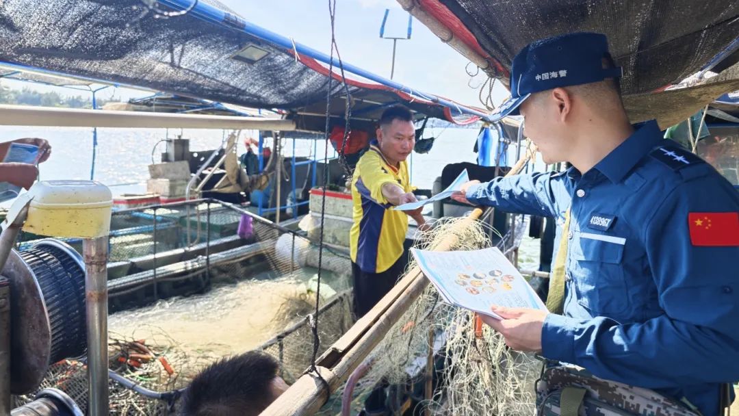 圖為6月20日,海南海警局執(zhí)法員向漁民發(fā)放禁毒宣傳單。