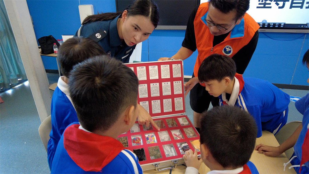 圖為海警執(zhí)法員向同學(xué)們講解毒品類型。