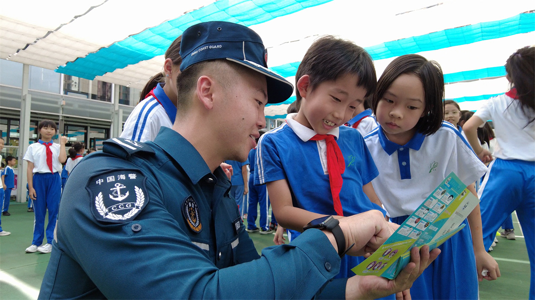 圖為海警執(zhí)法員向同學(xué)們發(fā)放禁毒預(yù)防宣傳折頁。