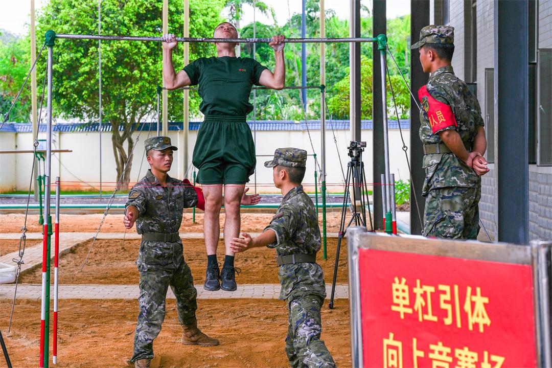 圖為參賽官兵正在進行單杠引體向上競賽。