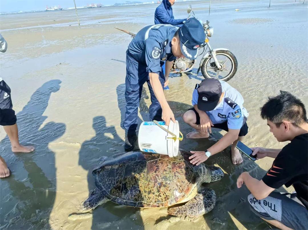 為避免綠海龜遭受二次傷害,執(zhí)法員一邊清理附近沙石雜物,一邊采用水桶澆水方式對其進行保濕。觀察一段時間后,綠海龜生命體征和行動能力開始逐漸恢復(fù),隨即被送至安全開闊海域放生。