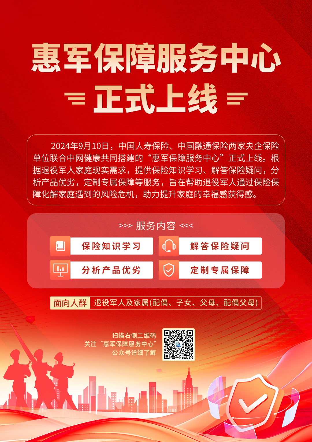 可關(guān)注“惠軍保障服務(wù)中心”公眾號,了解、咨詢退役軍人專屬保險服務(wù)內(nèi)容。通過增強(qiáng)保險知識,選擇適合保障,防患未然、抵御風(fēng)險,為自己的美好幸福生活筑堤護(hù)坡、保駕護(hù)航!