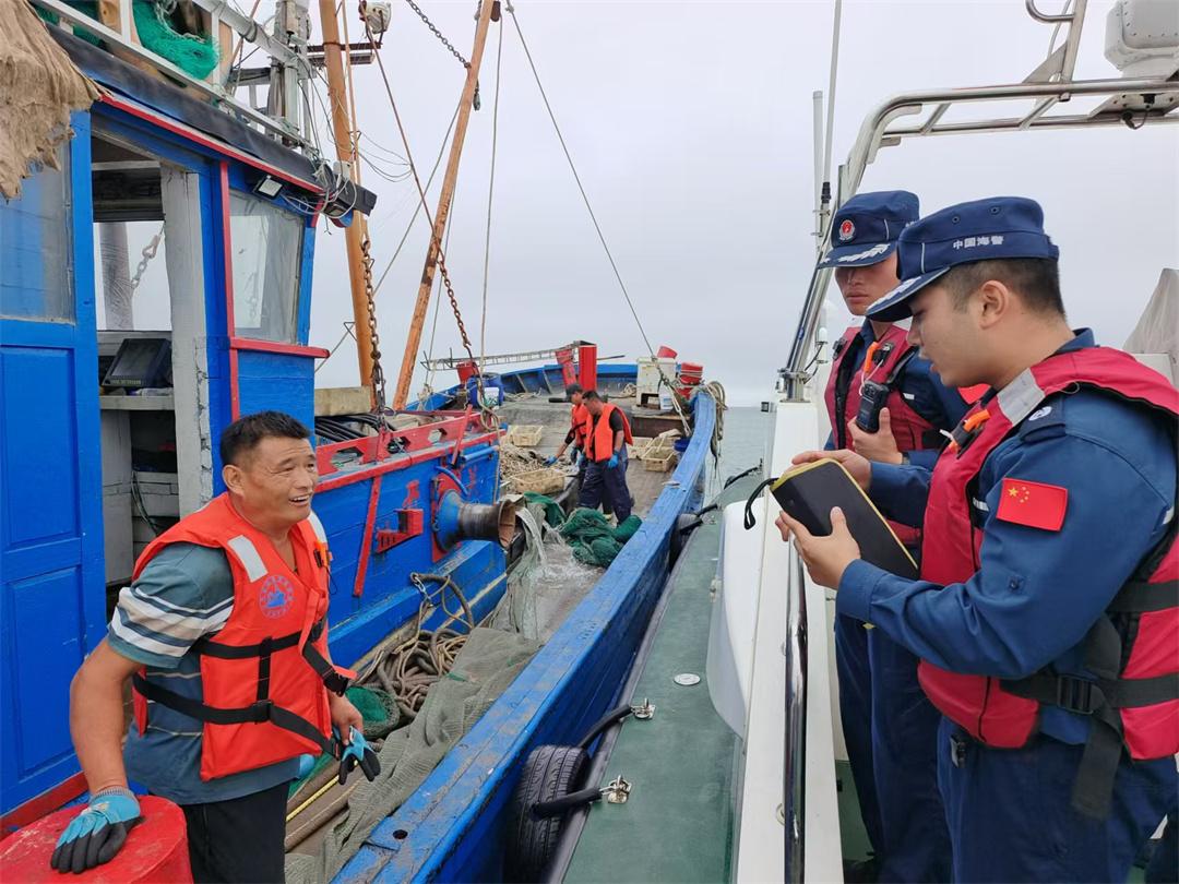 圖為9月5日,山東煙臺海警局長島工作站執(zhí)法員在轄區(qū)海域登檢作業(yè)漁船。劉鑫 攝