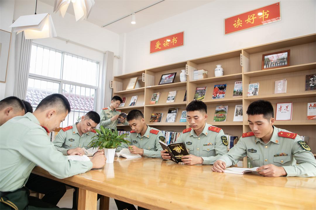 圖為武警官兵在強(qiáng)軍書(shū)屋靜心閱讀書(shū)刊。