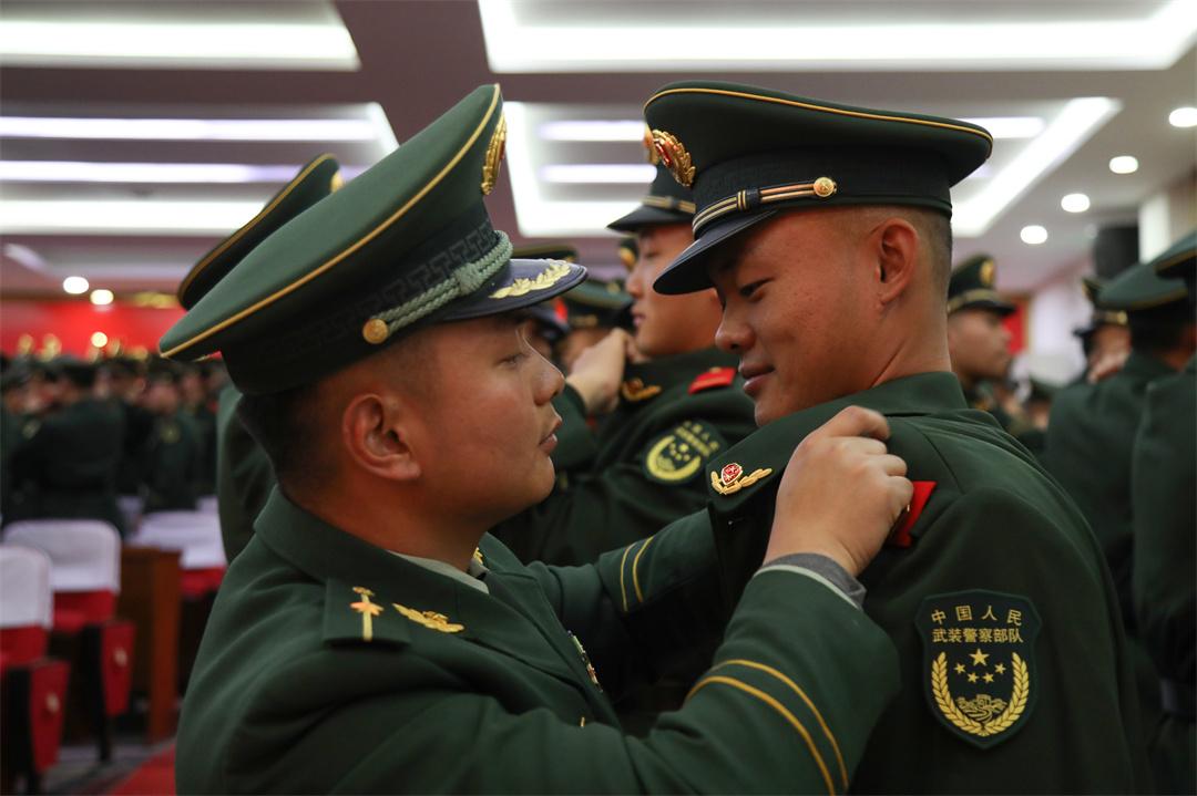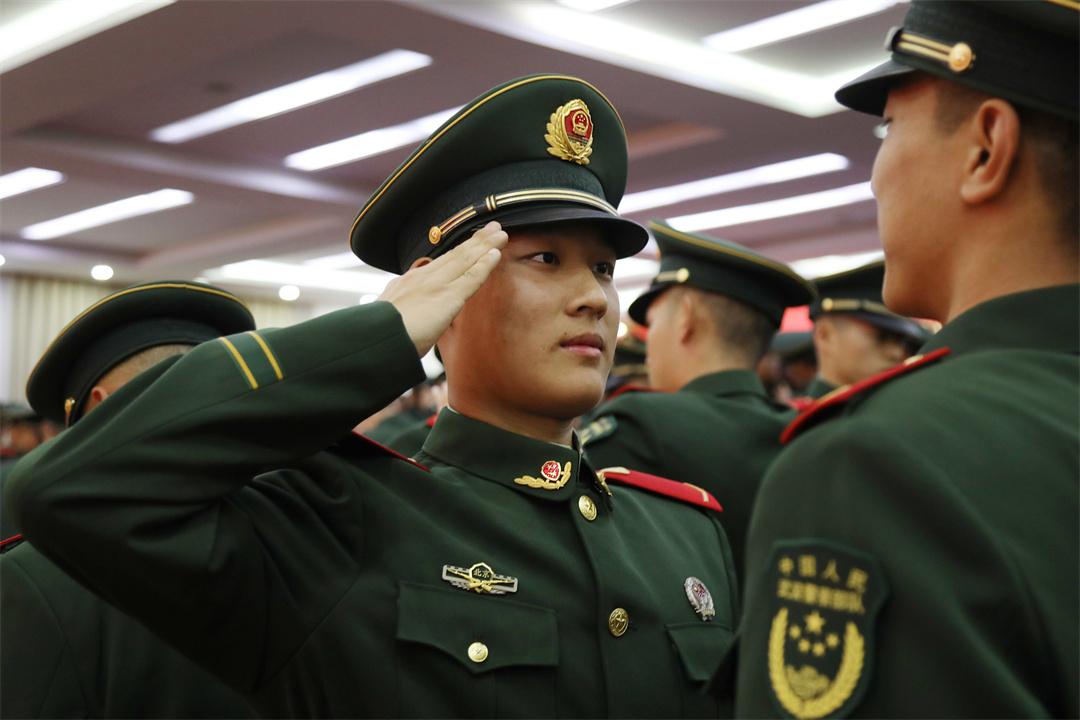 授銜儀式上,全體新戰(zhàn)友相互佩戴嶄新的紅肩章和閃耀的警徽,互敬軍禮,眼神中閃爍著驕傲與自豪的光芒。從這一刻起,他們正式成為武警部隊的一員,肩負起保家衛(wèi)國神圣使命?!翱嗑殮潮绢I,時刻準備戰(zhàn)斗,決不叛離軍隊,誓死保衛(wèi)祖國?!比w新兵高舉右拳莊嚴宣誓,誓詞鏗鏘,字字千鈞,詮釋著軍人的使命和擔當。