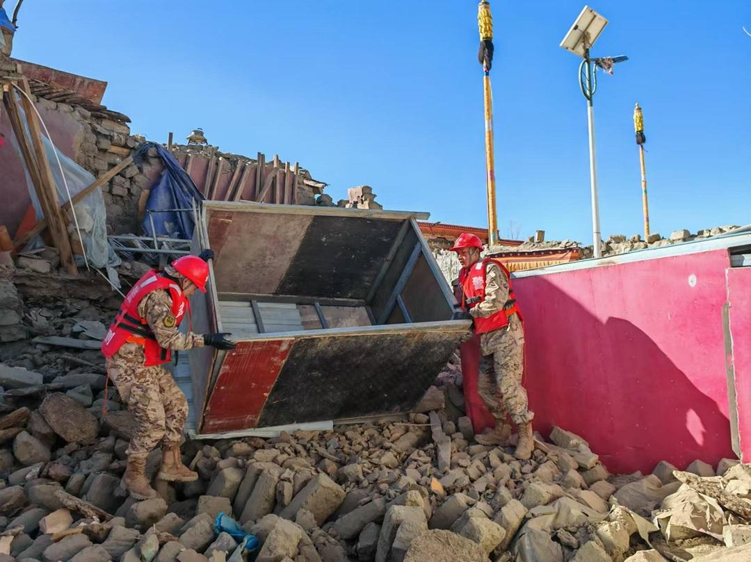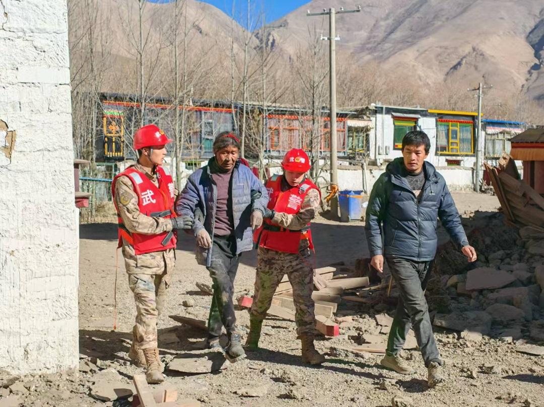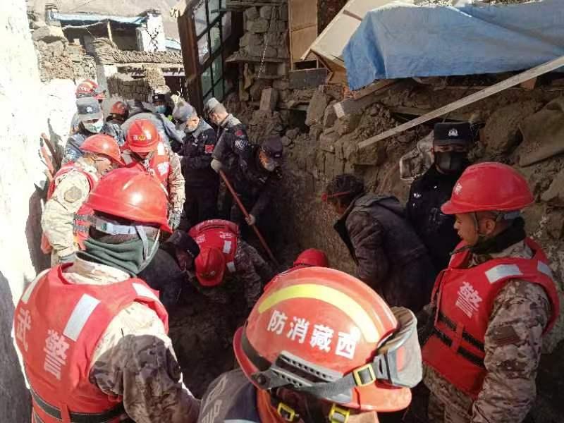 圖為西藏自治區(qū)日喀則市定日縣長所鄉(xiāng)森嘎村,武警日喀則官兵正在展開救援。