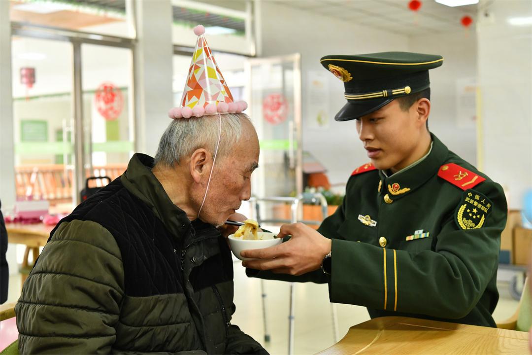 圖為官兵喂福利院高齡生日老人吃長壽面。