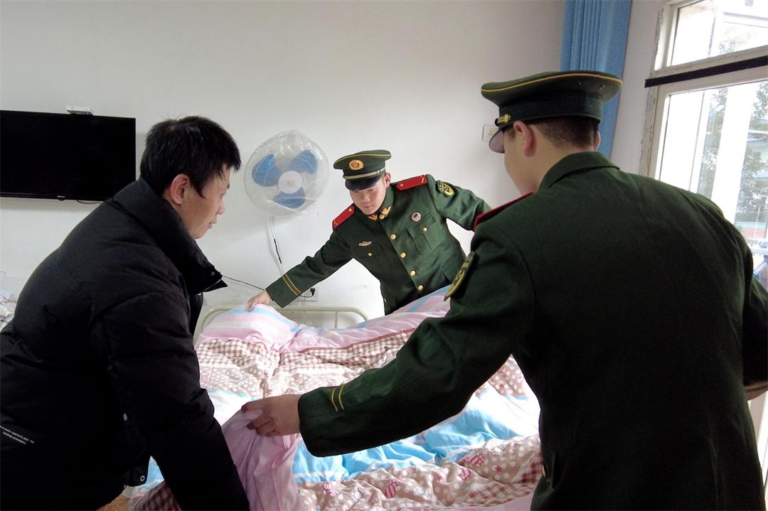 圖為官兵為駐地福利院老人整理被子。