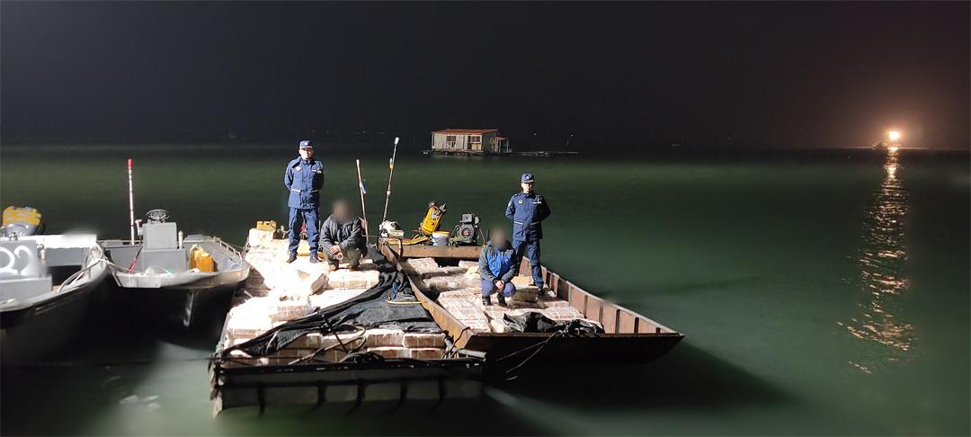 圖為2月20日,廣西海警局執(zhí)法艇位廣西東興市江平鎮(zhèn)巫頭十涵附近海域,查獲可疑船排2艘查獲凍品4.5噸。