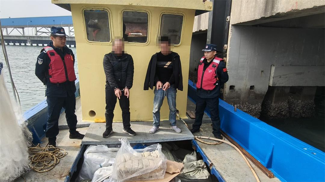 圖為去年12月27日,廣東江門海警局在廣東上川島附近海域查扣涉案船舶1艘,查獲牛百葉等凍品約6噸,抓獲嫌疑人2名。
