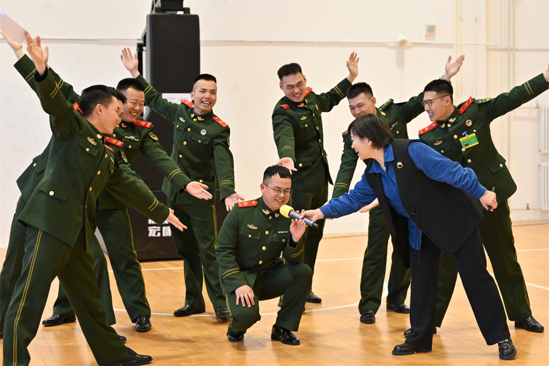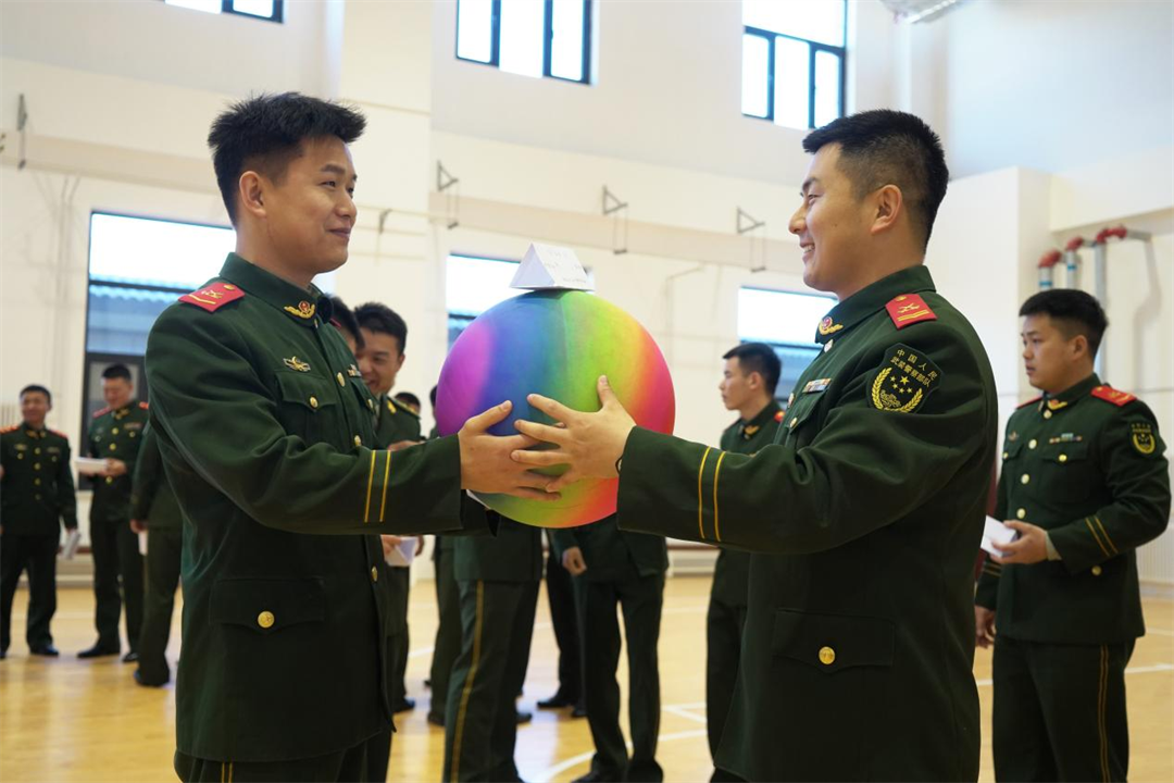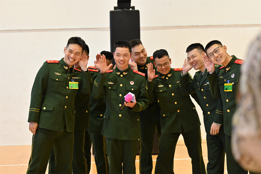 “快快快,到你了。”互動(dòng)現(xiàn)場(chǎng)到處洋溢著歡聲笑語,“找相似”“桃花朵朵開”等互動(dòng)游戲正在火熱進(jìn)行,官兵們?cè)谛睦砝蠋煄ьI(lǐng)下用趣味游戲盡情釋放壓力。