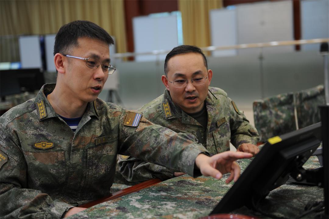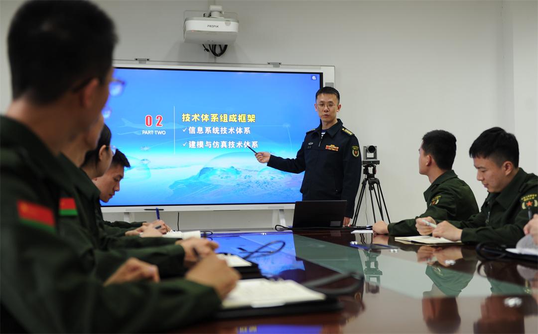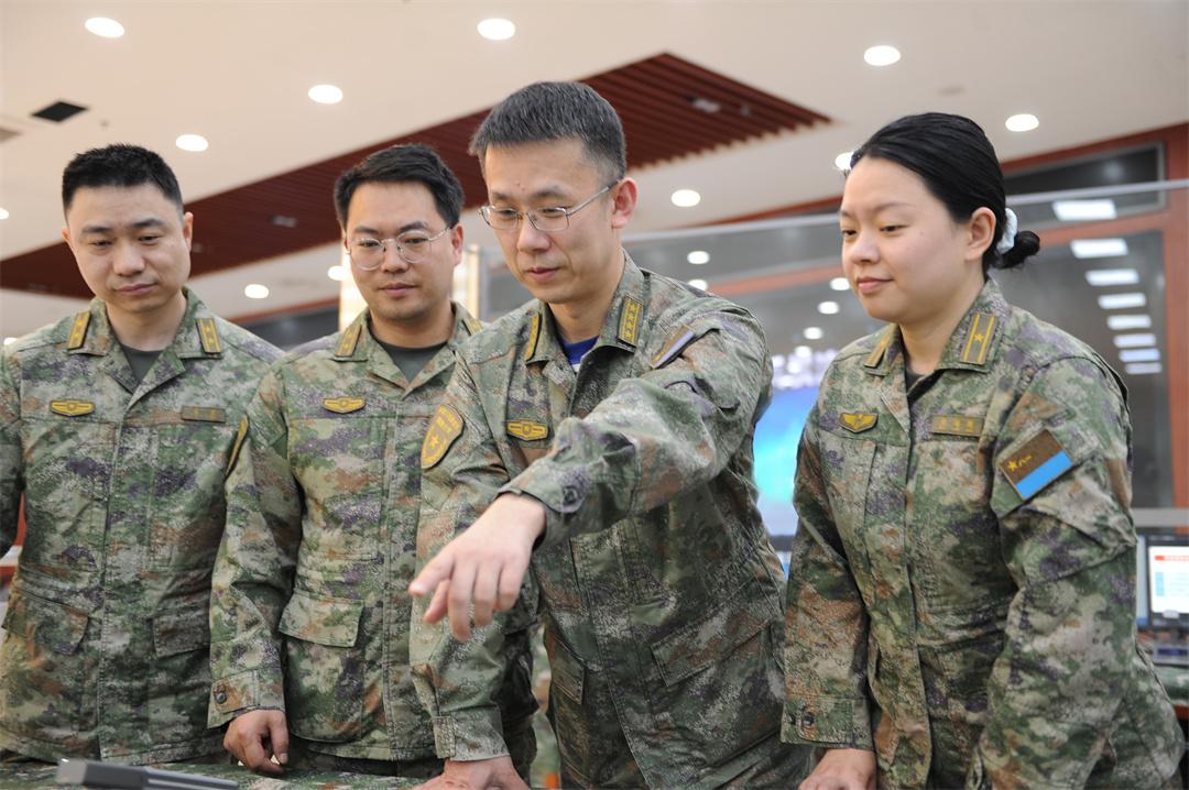 圖為吳琳(右二)和團(tuán)隊(duì)成員分析評估戰(zhàn)場態(tài)勢。