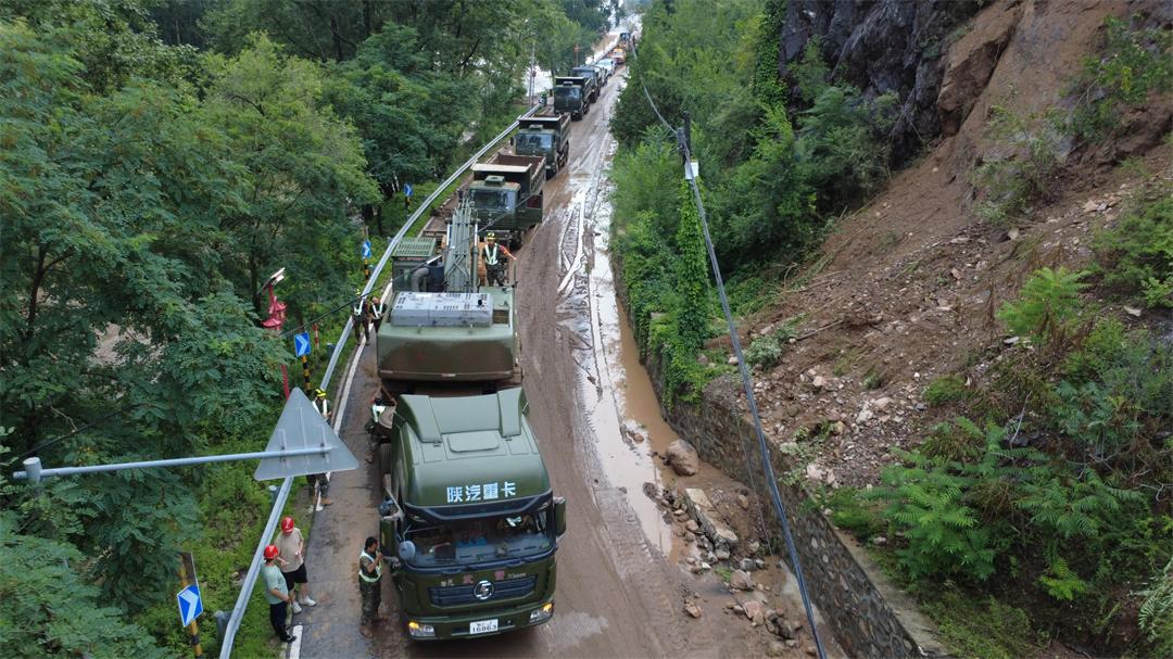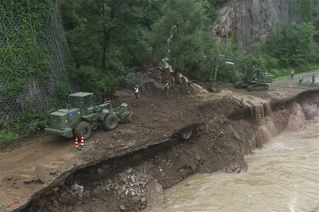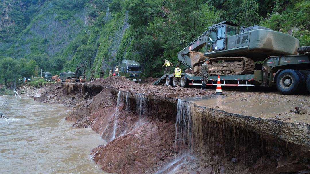 山洪造成多處道路中斷,人員車輛無法通行,武警官兵采取人歇機(jī)不歇的方式連夜搶通道路。