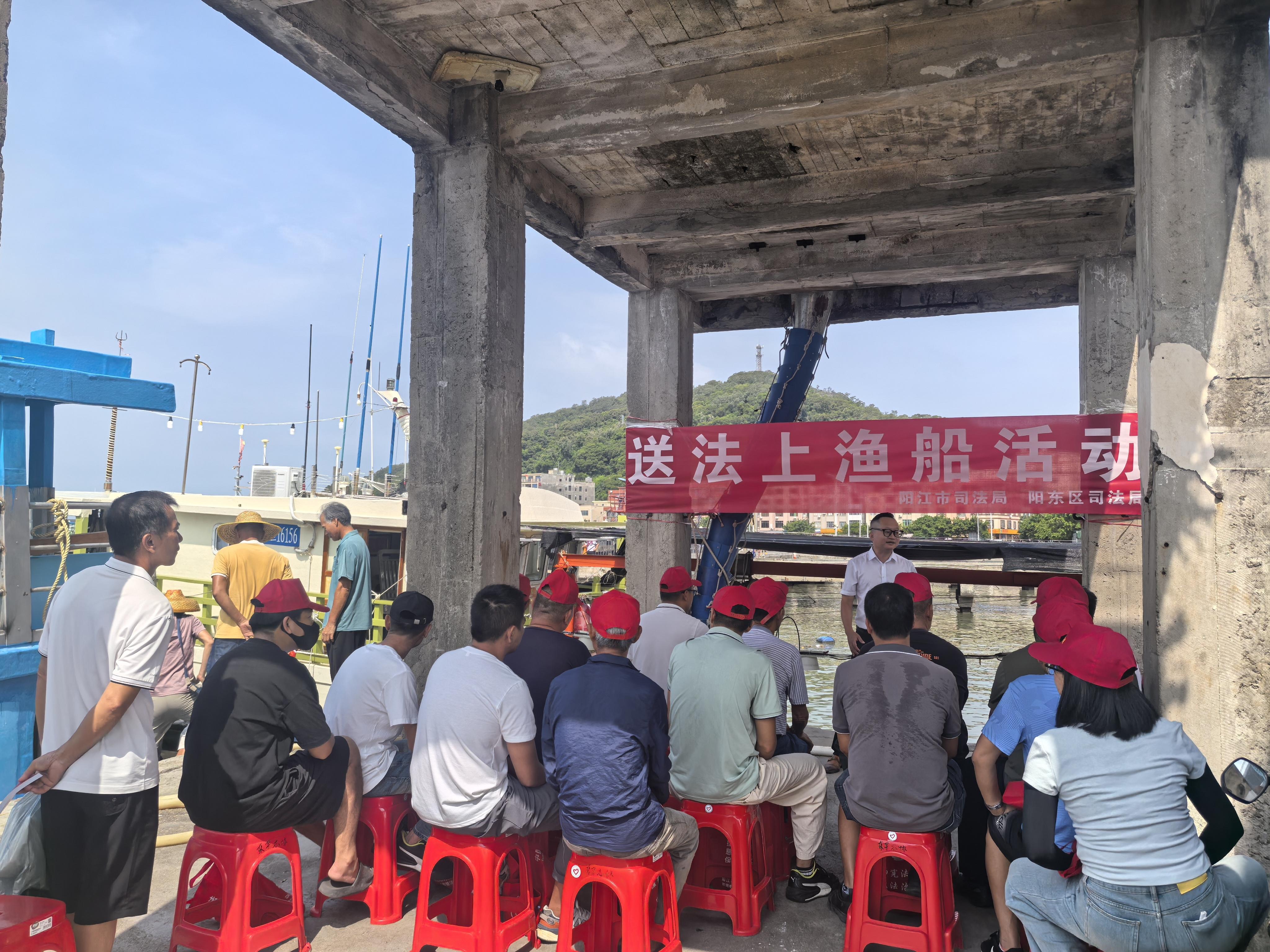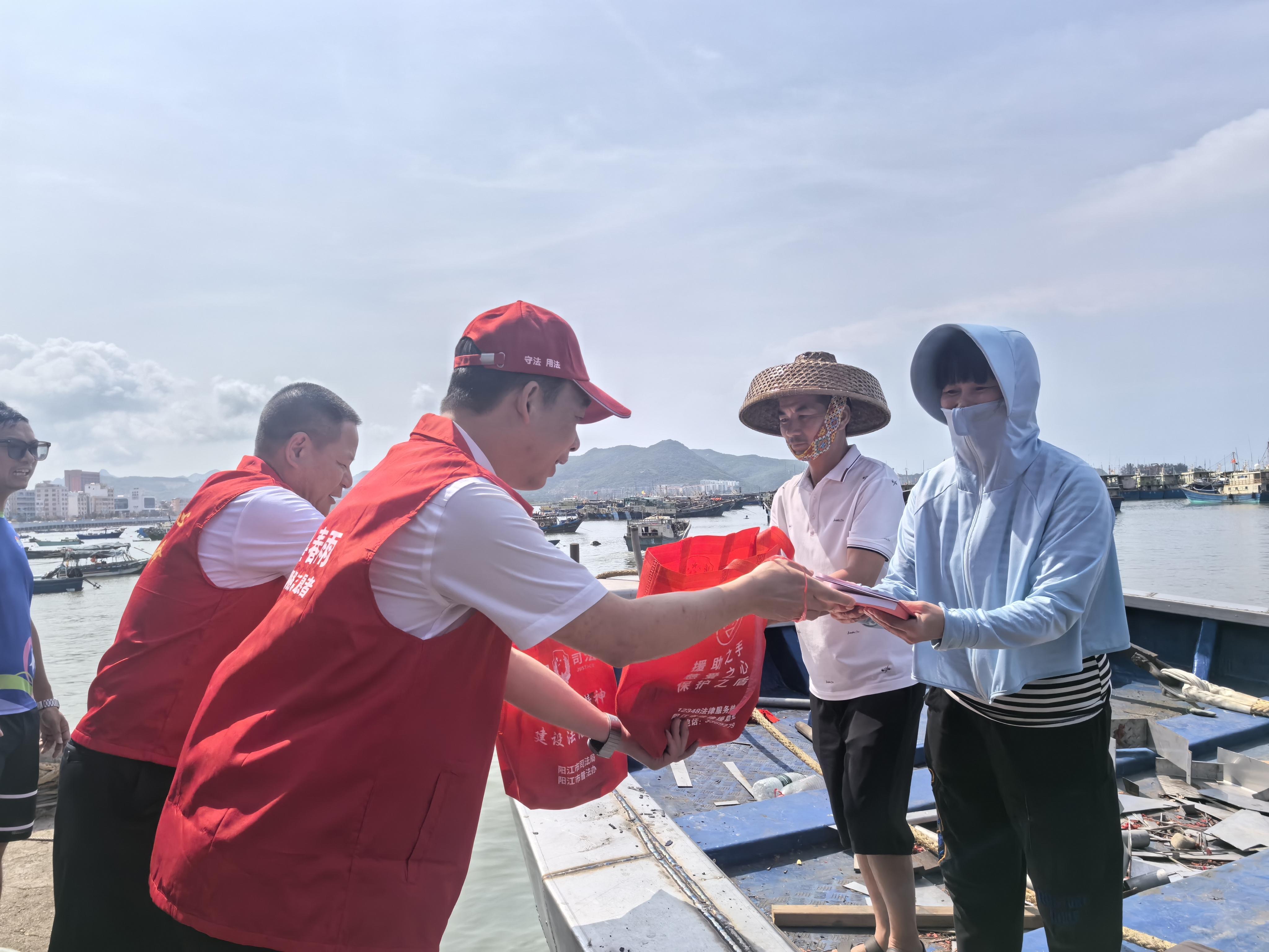 “師傅,這是民法典和法律援助指南,遇到糾紛可以照著上面的指引找我們!”休漁期的陽東區(qū)東平鎮(zhèn)、陽西縣沙扒鎮(zhèn)漁港內(nèi),普法志愿者分組登上漁船,將沉甸甸的“法治大禮包”送到漁民手中。