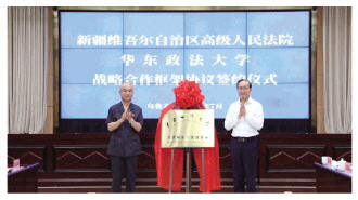 本報(bào)訊 記者余東明 近日,華東政法大學(xué)與新疆維吾爾自治區(qū)高級(jí)人民法院簽署戰(zhàn)略合作框架協(xié)議,簽約儀式在自治區(qū)高院舉行。華東政法大學(xué)黨委副書(shū)記、校長(zhǎng)葉青和新疆維吾爾自治區(qū)高院黨組成員、副院長(zhǎng)王浪濤代表雙方簽署戰(zhàn)略合作框架協(xié)議,共同為“自治區(qū)高級(jí)人民法院 華東政法大學(xué)法學(xué)研究與實(shí)踐基地暨法院系統(tǒng)高層次人才進(jìn)修基地”揭牌,標(biāo)志著華東政法大學(xué)與新疆法院共建法律人才培養(yǎng)機(jī)制的工作取得新的進(jìn)展,對(duì)于推動(dòng)全區(qū)創(chuàng)新法治人才培養(yǎng)和提升法治專(zhuān)門(mén)隊(duì)伍革命化、正規(guī)化、專(zhuān)業(yè)化、職業(yè)化水平具有重要意義。