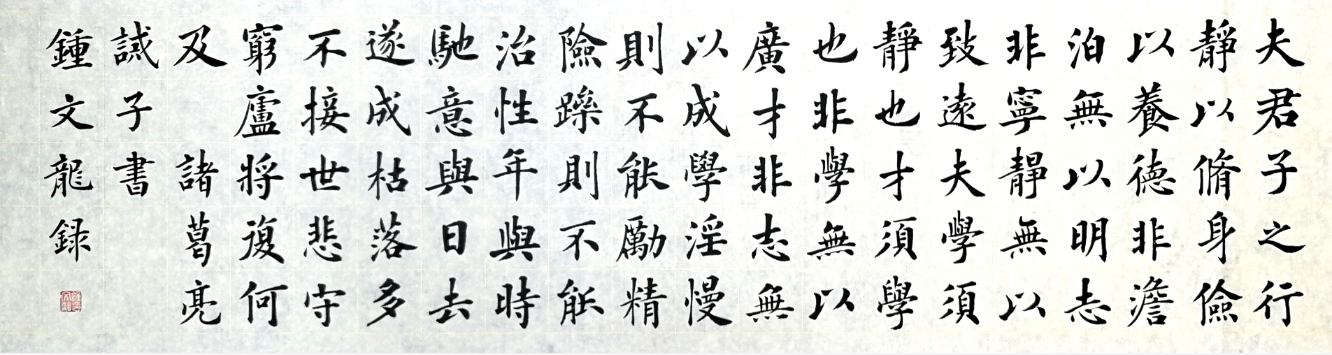 2010年,鐘文龍拜盧中南先生為師,由于自身基礎(chǔ)牢固加之得到名師指點,其楷書技藝得以迅速提高,大幅飛躍。