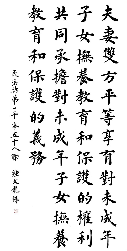 2020年7月11日,司法部普法與依法治理局和法制日報社共同主辦了“書·法”系列活動。鐘文龍先生應(yīng)邀書寫民法典第一千零五十八條: “夫妻雙方平等享有對未成年子女撫養(yǎng)、教育和保護的權(quán)利,共同承擔對未成年子女撫養(yǎng)、教育和保護的義務(wù)。”因其作品周正雅致而頗受好評。