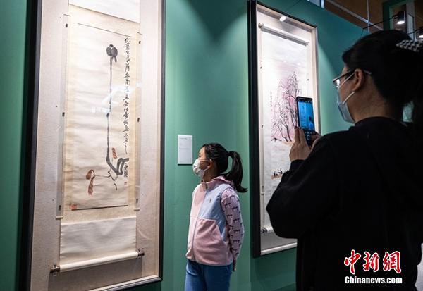 4月13日,市民在北京榮寶齋欣賞在此舉辦的“南張北齊——張大千齊白石書(shū)畫(huà)藝術(shù)特展”。本次特展精選張大千與齊白石一生早、中、晚三個(gè)時(shí)期,近五十件(組)佳作,完整地涵蓋了兩位世紀(jì)巨匠各個(gè)時(shí)期的創(chuàng)作面貌。圖為家長(zhǎng)帶小朋友參觀(guān)齊白石《仿八大山人鳥(niǎo)木圖》。中新社記者 侯宇 攝
