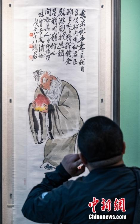 4月13日,市民在北京榮寶齋欣賞在此舉辦的“南張北齊——張大千齊白石書(shū)畫(huà)藝術(shù)特展”。本次特展精選張大千與齊白石一生早、中、晚三個(gè)時(shí)期,近五十件(組)佳作,完整地涵蓋了兩位世紀(jì)巨匠各個(gè)時(shí)期的創(chuàng)作面貌。圖為齊白石《東方朔盜桃圖》吸引一位男士駐足欣賞。中新社記者 侯宇 攝