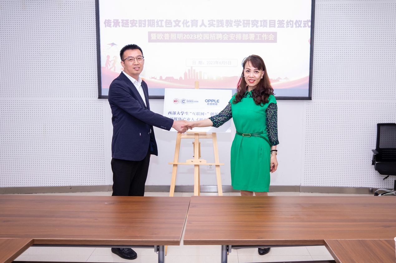 (西北政法大學(xué)新聞傳播學(xué)院(藝術(shù)學(xué)院)副院長與歐普照明股份有限公司陜西分公司副總經(jīng)理王世新為“西部大學(xué)生互聯(lián)網(wǎng)+大學(xué)生創(chuàng)新創(chuàng)業(yè)數(shù)字新媒體產(chǎn)業(yè)人才孵化實(shí)訓(xùn)基地”揭牌)