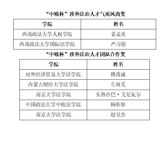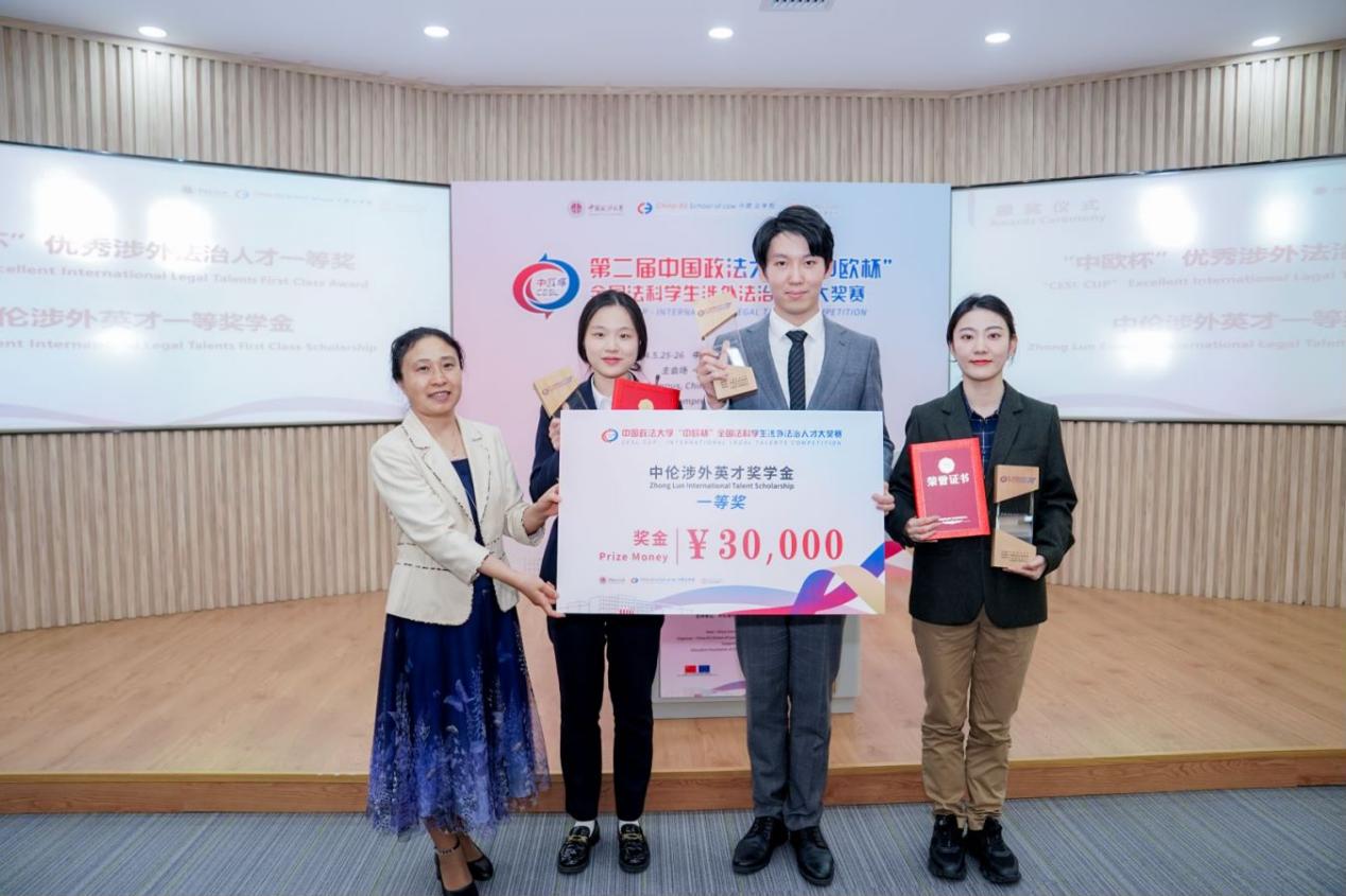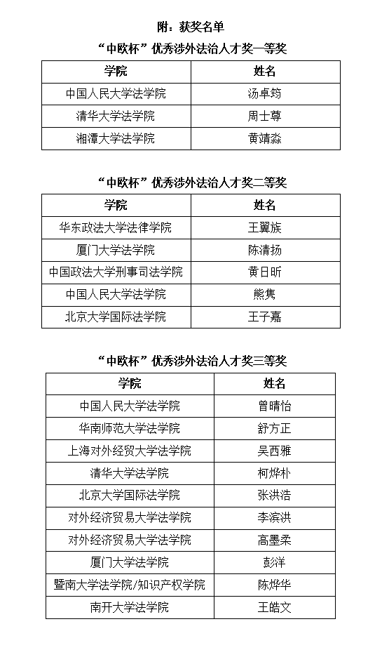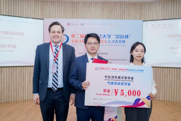 經(jīng)過(guò)激烈角逐,最終,中國(guó)人民大學(xué)湯卓筠、清華大學(xué)周士尊、湘潭大學(xué)黃靖淼3名選手榮獲“中歐杯”優(yōu)秀涉外法治人才一等獎(jiǎng)。另有22名選手分別獲“中歐杯”優(yōu)秀涉外法治人才二等獎(jiǎng)、三等獎(jiǎng)、“涉外法治人才氣質(zhì)風(fēng)尚獎(jiǎng)”“涉外法治人才團(tuán)隊(duì)合作獎(jiǎng)”等。在5月26日下午舉行的閉幕式暨頒獎(jiǎng)儀式上,中國(guó)政法大學(xué)黨委副書(shū)記王立艷、中倫律師事務(wù)所高級(jí)顧問(wèn)王霽虹等為選手頒獎(jiǎng)。獲獎(jiǎng)同學(xué)同時(shí)獲得“中倫涉外英才獎(jiǎng)學(xué)金”。