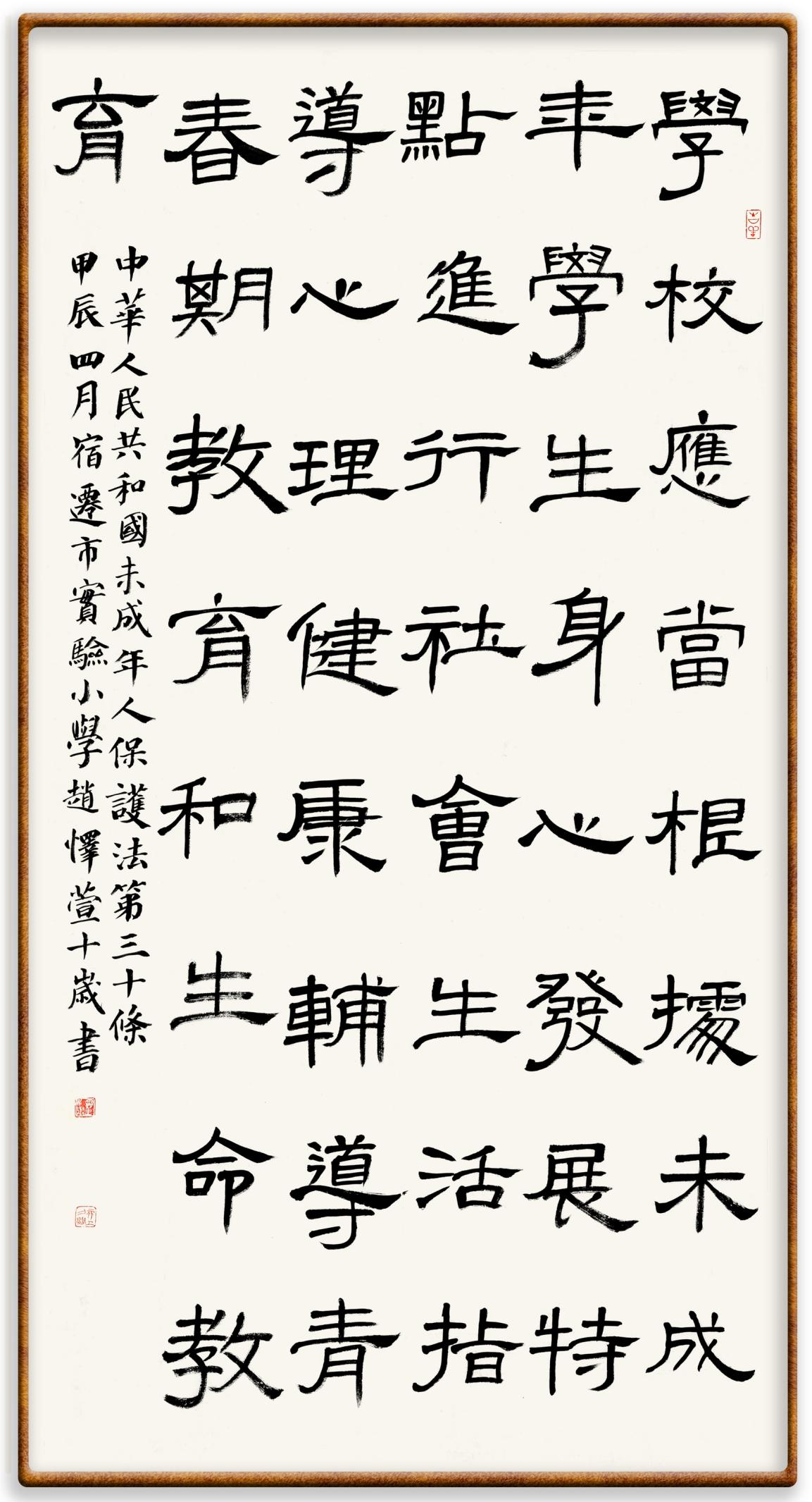 “六一”國際兒童節(jié)來臨之際,法制日報社聯(lián)合(全國)教育書畫協(xié)會基礎(chǔ)書法教育分會,推出“‘書·法’系列活動之書寫《中華人民共和國未成年人保護(hù)法》活動”,邀請小朋友書寫部分法條,讓孩子們在濃濃的節(jié)日氛圍中感受傳統(tǒng)文化的獨(dú)特魅力。
