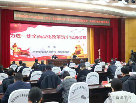 11月29日,黑龍江省鶴崗市委理論學(xué)習(xí)中心組集體(擴大)學(xué)習(xí)暨2024年“百名法學(xué)家百場報告會”法治宣講專場報告會在鶴崗舉行,邀請中央黨校政法部教授、博士生導(dǎo)師李勇作專題講座。鶴崗市委書記王興柱及市委理論學(xué)習(xí)中心組成員,市級班子秘書長、市直各單位主要領(lǐng)導(dǎo)、各縣區(qū)領(lǐng)導(dǎo)、政法各單位科以上干部及法學(xué)會全體會員參加。兩縣六區(qū)、市公安局、市教育培訓(xùn)基地設(shè)立分會場,共1100余人參會。市委副書記、市委政法委書記馬春波主持。
