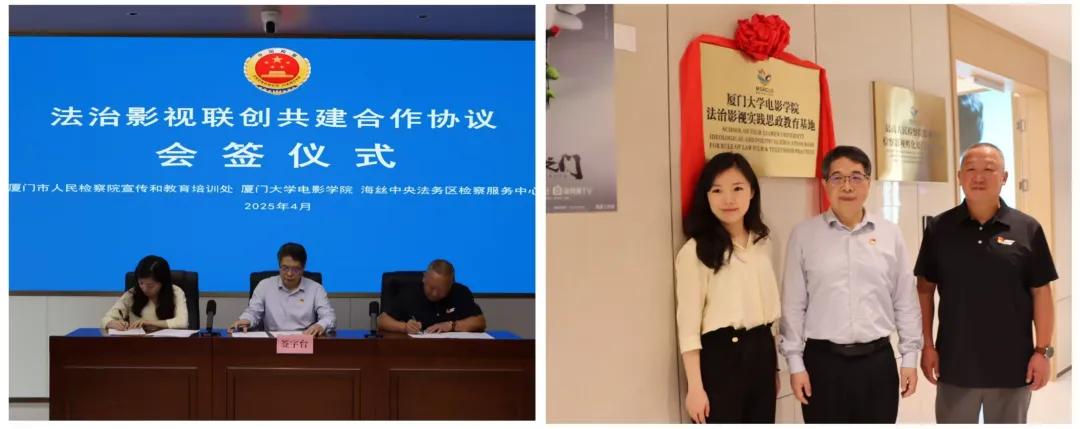 楊善良、林公明、張櫪文分別代表廈門市人民檢察院宣傳和教育培訓(xùn)處、廈門大學(xué)電影學(xué)院、海絲中央法務(wù)區(qū)檢察服務(wù)中心簽訂聯(lián)創(chuàng)共建協(xié)議,共同為“廈門大學(xué)電影學(xué)院法治影視實踐思政教育基地”揭牌。