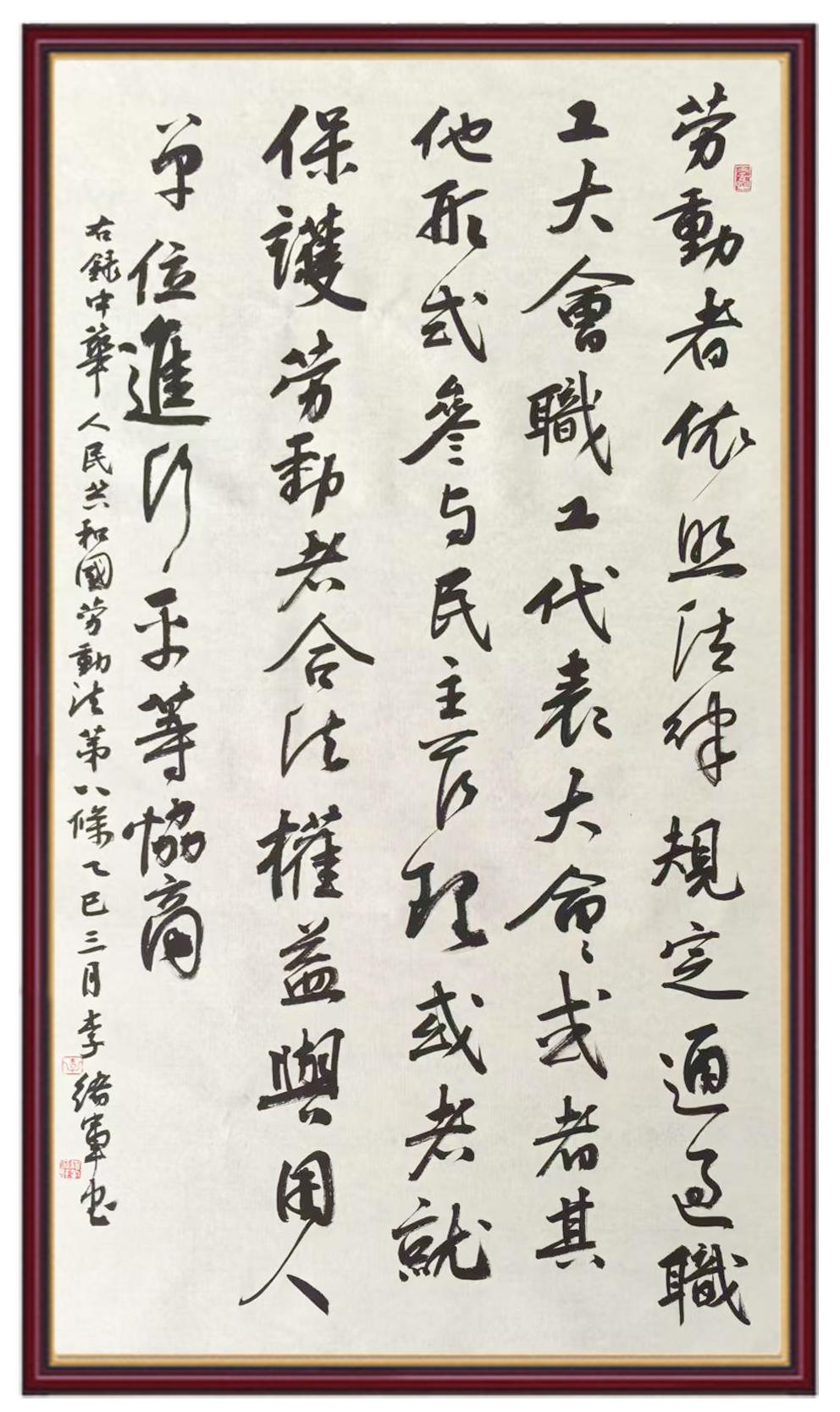 法律,是勞動者披荊斬棘的鎧甲;書法,是法治精神薪火相傳的載體。
