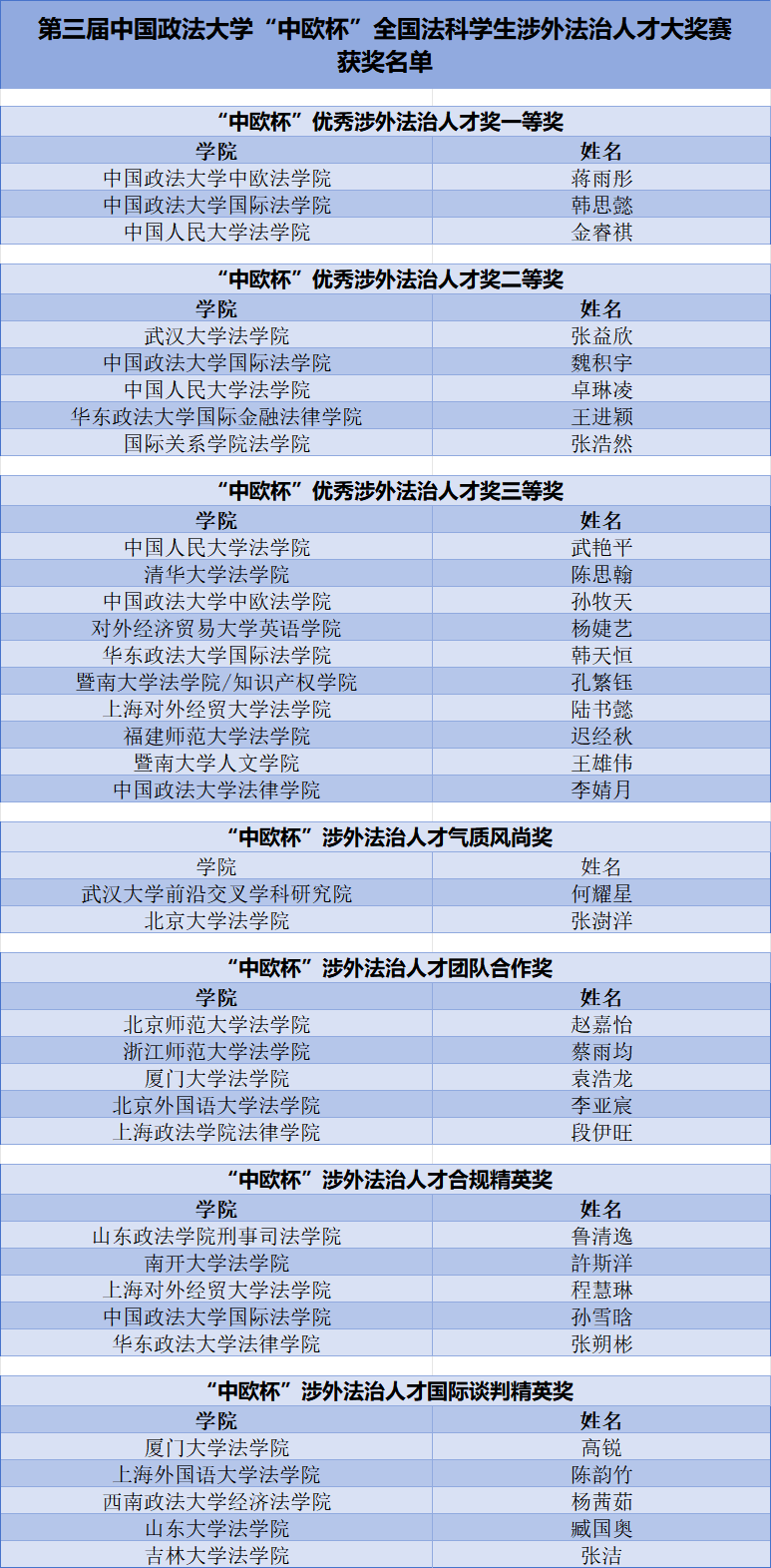 經(jīng)過(guò)激烈角逐,最終來(lái)自全國(guó)28所法學(xué)院系的35名同學(xué)脫穎而出。復(fù)賽共評(píng)選出:“中歐杯”優(yōu)秀涉外法治人才一等獎(jiǎng)3名、二等獎(jiǎng)5名、三等獎(jiǎng)10名,“涉外法治人才氣質(zhì)風(fēng)尚獎(jiǎng)”2名,“涉外法治人才團(tuán)隊(duì)合作獎(jiǎng)”5名,“涉外法治人才合規(guī)精英獎(jiǎng)”5名,“涉外法治人才國(guó)際談判精英獎(jiǎng)”5名。