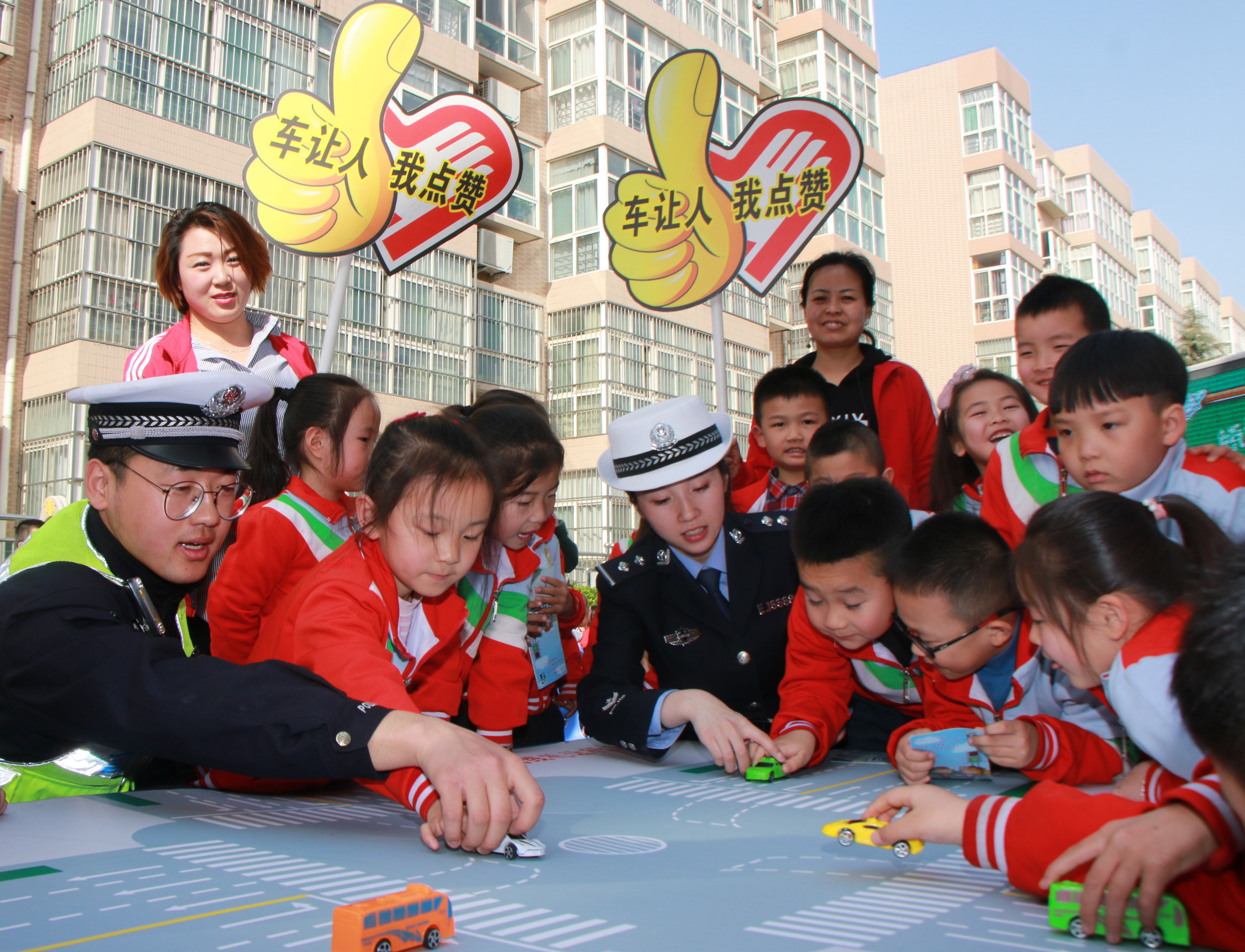 3月25日,陜西省渭南市澄城縣三維幼兒園,民警向小朋友講解如何安全過馬路。