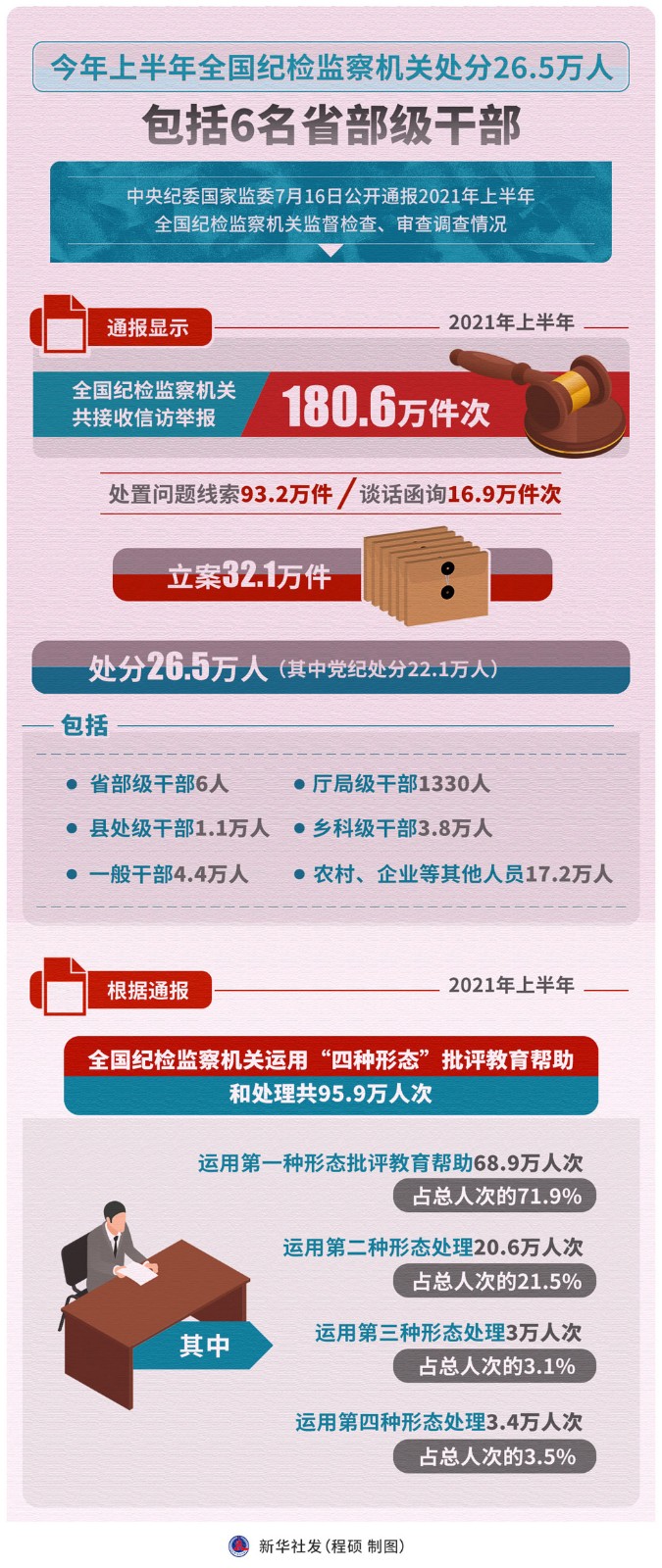 圖表:今年上半年全國紀檢監(jiān)察機關(guān)處分26.5萬人 包括6名省部級干部
