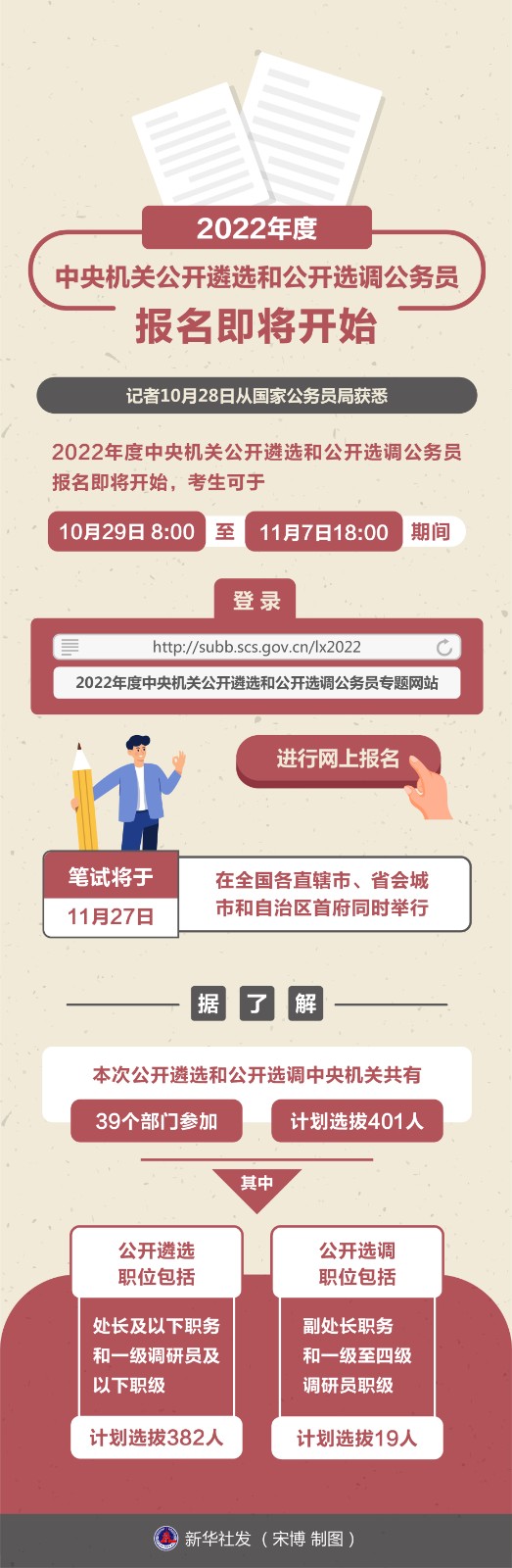 記者10月28日從國家公務(wù)員局獲悉,2022年度中央機(jī)關(guān)公開遴選和公開選調(diào)公務(wù)員報(bào)名即將開始,考生可于10月29日8:00至11月7日18:00期間,登錄“2022年度中央機(jī)關(guān)公開遴選和公開選調(diào)公務(wù)員專題網(wǎng)站”(http://subb.scs.gov.cn/lx2022)進(jìn)行網(wǎng)上報(bào)名,筆試將于11月27日在全國各直轄市、省會城市和自治區(qū)首府同時(shí)舉行。