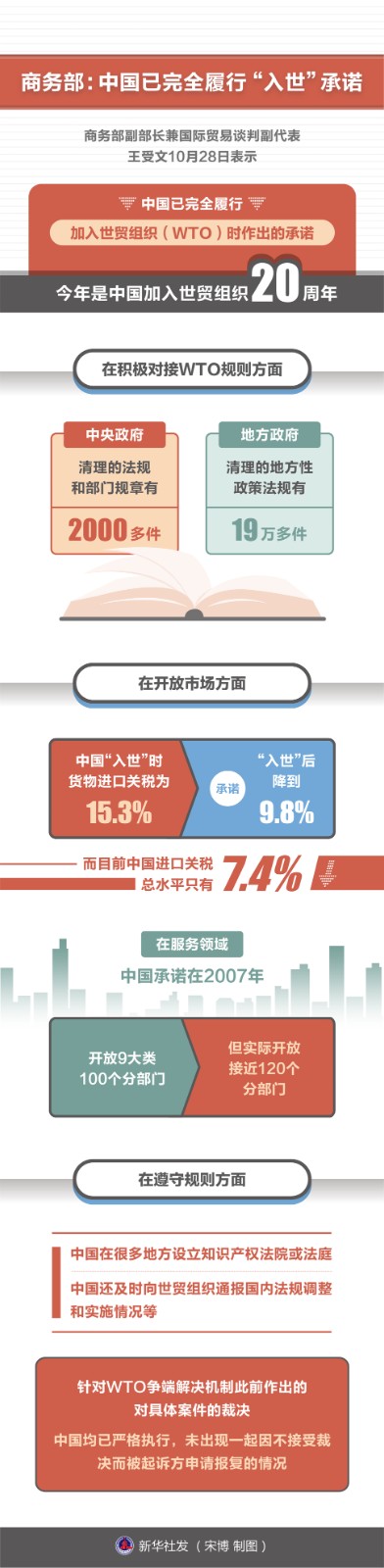 商務(wù)部副部長兼國際貿(mào)易談判副代表王受文10月28日表示,中國已完全履行加入世貿(mào)組織(WTO)時作出的承諾,WTO幾任總干事及大部分WTO成員都對此給予充分肯定和普遍認(rèn)可。