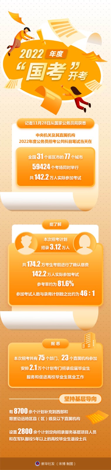 記者11月28日從國家公務(wù)員局獲悉,中央機關(guān)及其直屬機構(gòu)2022年度公務(wù)員招考公共科目筆試當(dāng)天在全國31個省區(qū)市的77個城市、59424個考場同時舉行,共142.2萬人實際參加考試。