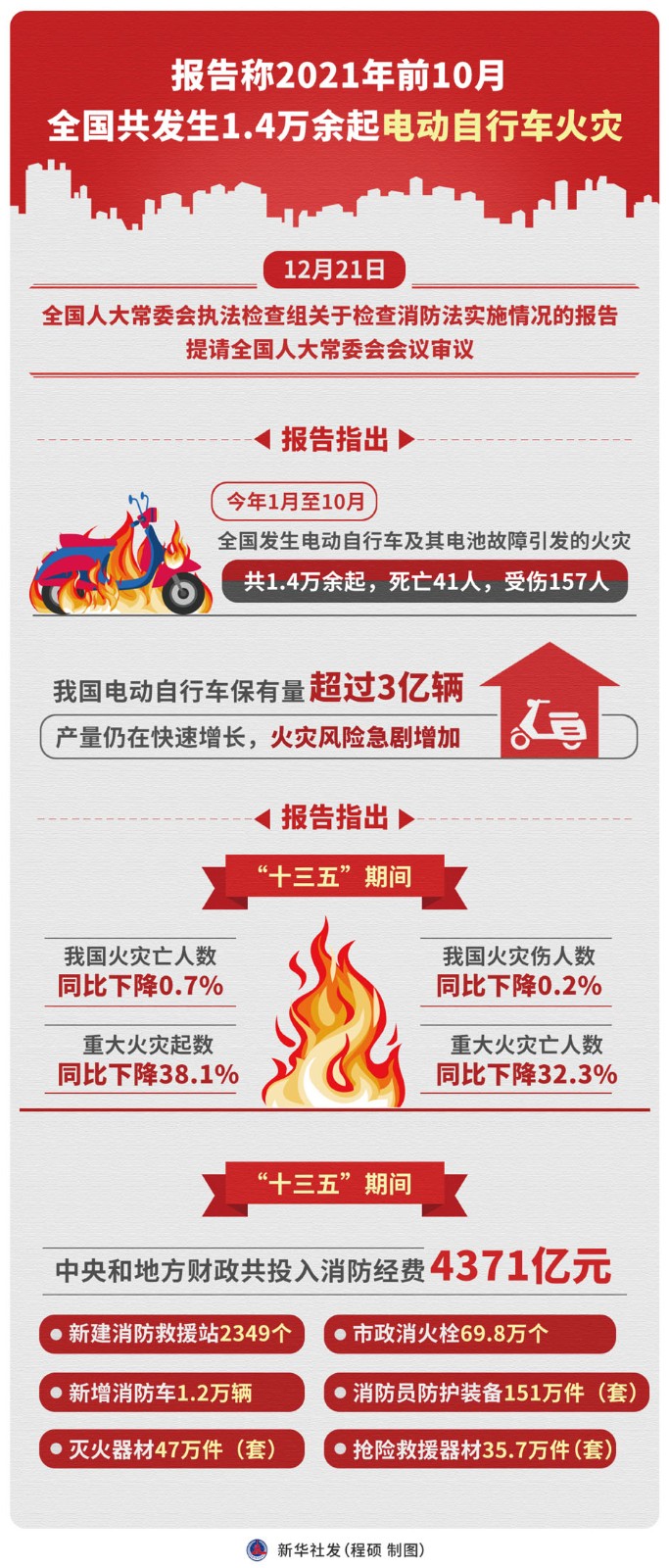 12月21日,全國人大常委會(huì)執(zhí)法檢查組關(guān)于檢查消防法實(shí)施情況的報(bào)告提請(qǐng)全國人大常委會(huì)會(huì)議審議。報(bào)告指出,今年1月至10月,全國發(fā)生電動(dòng)自行車及其電池故障引發(fā)的火災(zāi)共1.4萬余起,死亡41人,受傷157人。
