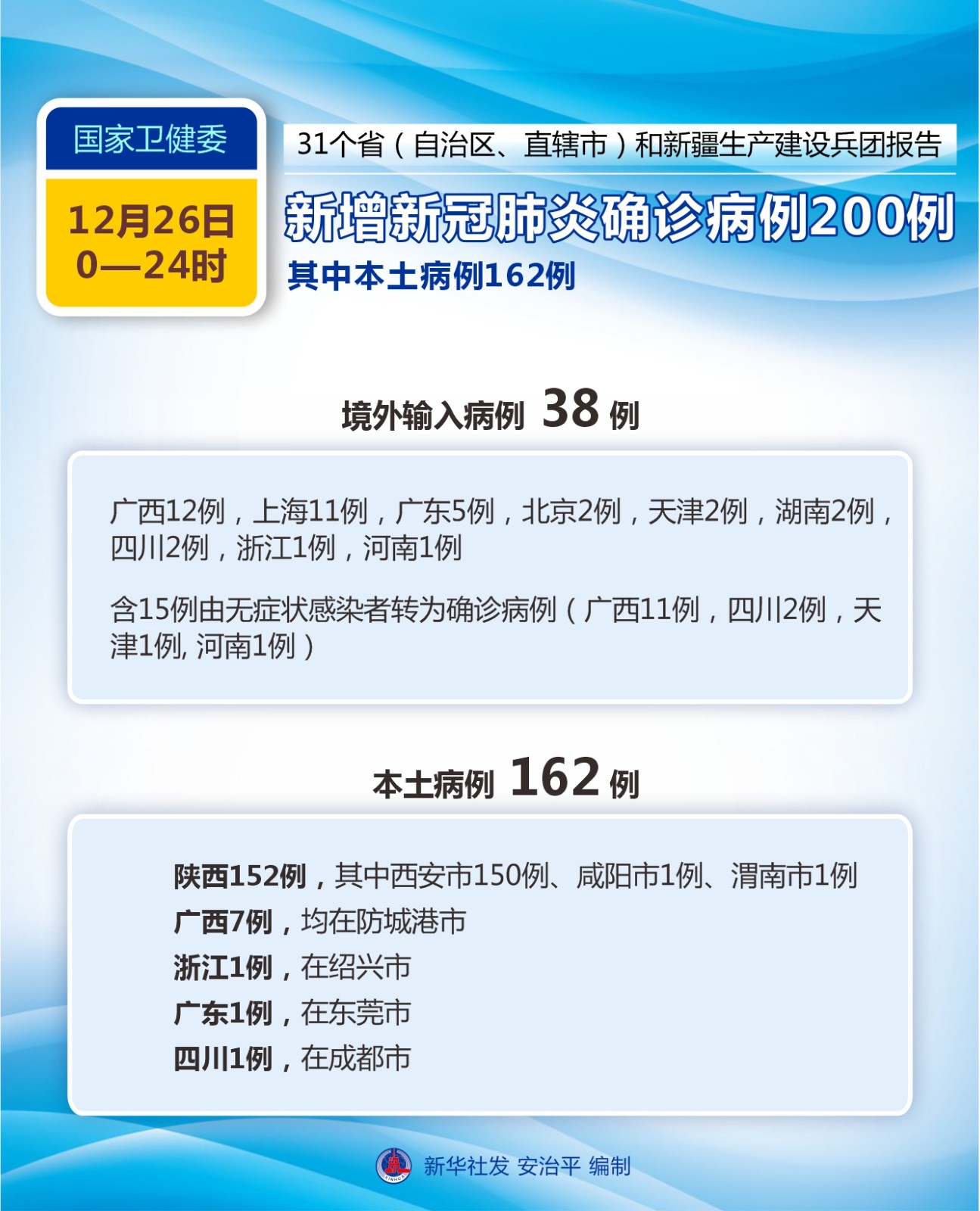 國(guó)家衛(wèi)生健康委員會(huì)12月27日通報(bào),12月26日0至24時(shí),31個(gè)?。ㄗ灾螀^(qū)、直轄市)和新疆生產(chǎn)建設(shè)兵團(tuán)報(bào)告新增新冠肺炎確診病例200例。其中境外輸入病例38例(廣西12例,上海11例,廣東5例,北京2例,天津2例,湖南2例,四川2例,浙江1例,河南1例),含15例由無(wú)癥狀感染者轉(zhuǎn)為確診病例(廣西11例,四川2例,天津1例,河南1例);本土病例162例(陜西152例,其中西安市150例、咸陽(yáng)市1例、渭南市1例;廣西7例,均在防城港市;浙江1例,在紹興市;廣東1例,在東莞市;四川1例,在成都市),含5例由無(wú)癥狀感染者轉(zhuǎn)為確診病例(均在廣西)。無(wú)新增死亡病例。新增疑似病例4例,均為境外輸入病例(上海2例,浙江2例)。