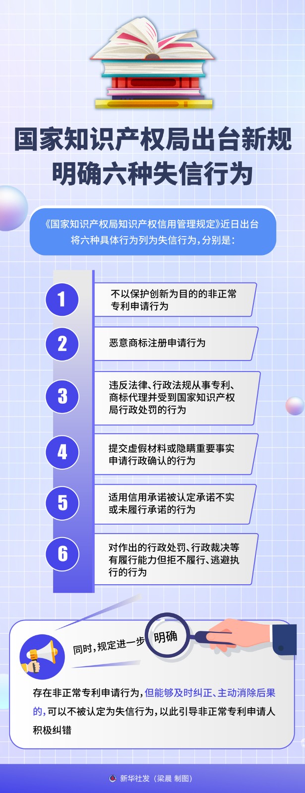 同時(shí),規(guī)定進(jìn)一步明確,存在非正常專(zhuān)利申請(qǐng)行為,但能夠及時(shí)糾正、主動(dòng)消除后果的,可以不被認(rèn)定為失信行為,以此引導(dǎo)非正常專(zhuān)利申請(qǐng)人積極糾錯(cuò)。