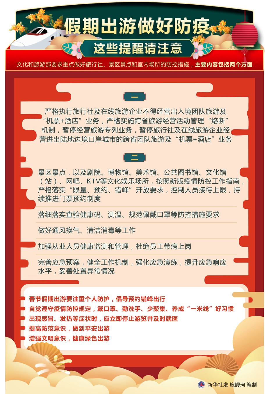 春節(jié)期間是人們出游的高峰時(shí)段。在當(dāng)前疫情形勢下,春節(jié)期間怎樣安全出游?各地又是如何按照精準(zhǔn)防控的要求保障廣大游客度過一個(gè)歡樂、祥和、平安的春節(jié)假期?