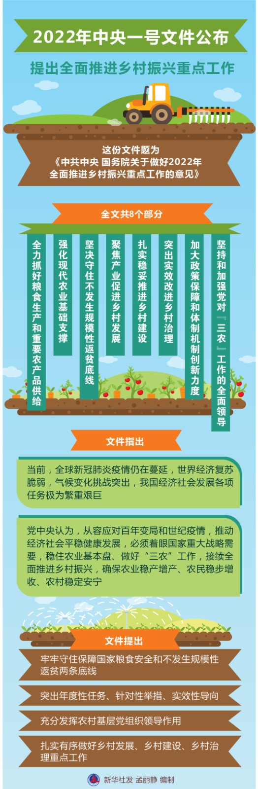 這份文件題為《中共中央 國(guó)務(wù)院關(guān)于做好2022年全面推進(jìn)鄉(xiāng)村振興重點(diǎn)工作的意見》,全文共8個(gè)部分,包括:全力抓好糧食生產(chǎn)和重要農(nóng)產(chǎn)品供給、強(qiáng)化現(xiàn)代農(nóng)業(yè)基礎(chǔ)支撐、堅(jiān)決守住不發(fā)生規(guī)模性返貧底線、聚焦產(chǎn)業(yè)促進(jìn)鄉(xiāng)村發(fā)展、扎實(shí)穩(wěn)妥推進(jìn)鄉(xiāng)村建設(shè)、突出實(shí)效改進(jìn)鄉(xiāng)村治理、加大政策保障和體制機(jī)制創(chuàng)新力度、堅(jiān)持和加強(qiáng)黨對(duì)“三農(nóng)”工作的全面領(lǐng)導(dǎo)。