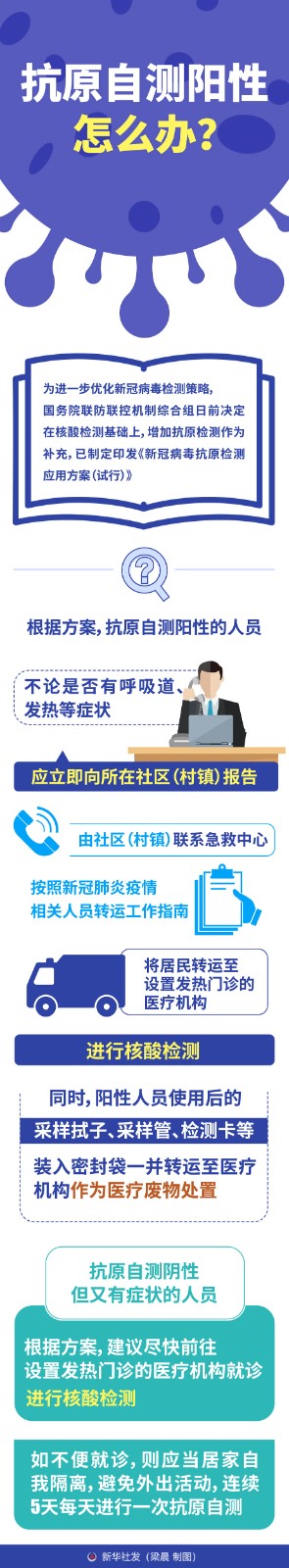 根據(jù)方案,抗原自測(cè)陽(yáng)性的人員,不論是否有呼吸道、發(fā)熱等癥狀,應(yīng)立即向所在社區(qū)(村鎮(zhèn))報(bào)告,由社區(qū)(村鎮(zhèn))聯(lián)系急救中心按照新冠肺炎疫情相關(guān)人員轉(zhuǎn)運(yùn)工作指南,將居民轉(zhuǎn)運(yùn)至設(shè)置發(fā)熱門(mén)診的醫(yī)療機(jī)構(gòu),進(jìn)行核酸檢測(cè)。