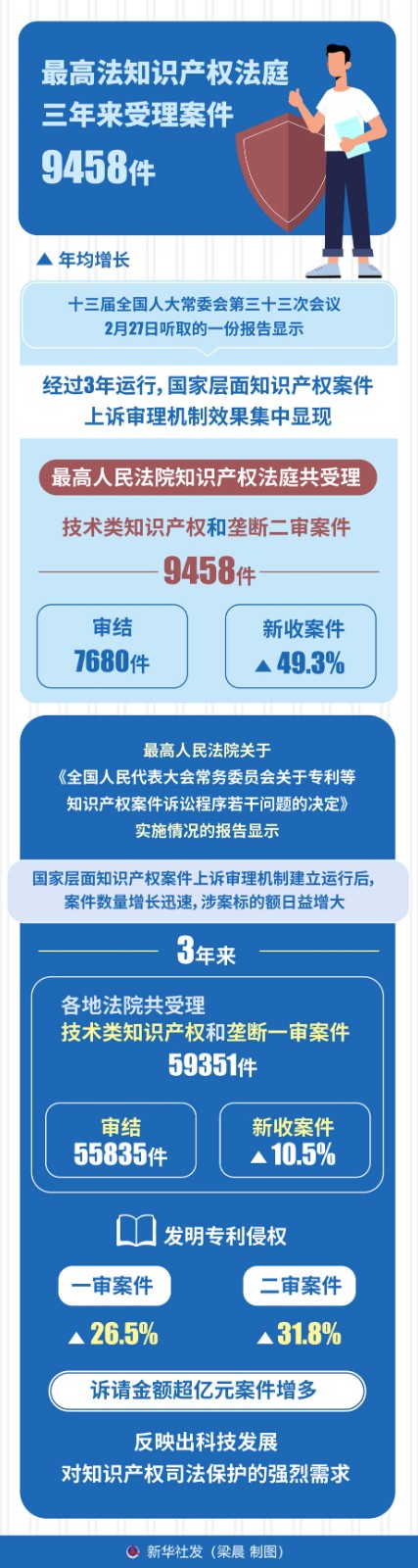 十三屆全國(guó)人大常委會(huì)第三十三次會(huì)議2月27日聽(tīng)取的一份報(bào)告顯示,經(jīng)過(guò)3年運(yùn)行,國(guó)家層面知識(shí)產(chǎn)權(quán)案件上訴審理機(jī)制效果集中顯現(xiàn),最高人民法院知識(shí)產(chǎn)權(quán)法庭共受理技術(shù)類(lèi)知識(shí)產(chǎn)權(quán)和壟斷二審案件9458件,審結(jié)7680件,新收案件年均增長(zhǎng)49.3%。