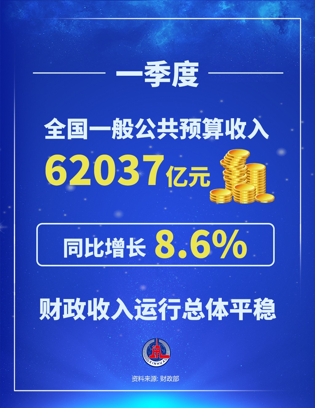 財政部4月20日發(fā)布數據顯示,一季度,全國一般公共預算收入62037億元,同比增長8.6%,財政收入運行總體平穩(wěn)。