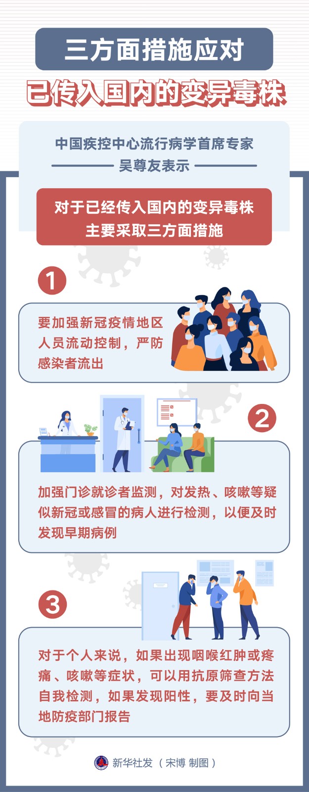 中國疾控中心流行病學(xué)首席專家吳尊友表示,對于已經(jīng)傳入國內(nèi)的變異毒株,主要采取三方面措施。
