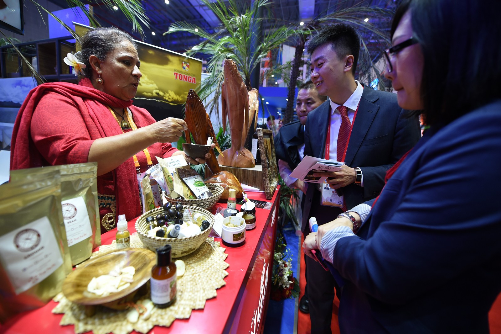 2018年11月6日,在首屆中國國際進(jìn)口博覽會(huì)上,太平洋島國展區(qū)湯加展臺(tái)的工作人員(左)向參觀者介紹展出的食品。