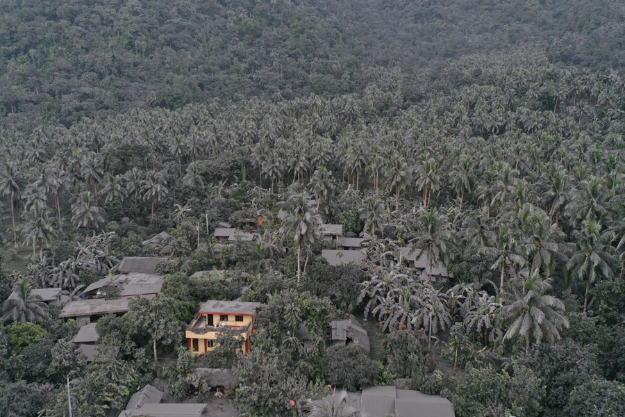 6月5日,菲律賓索索貢省的一個城鎮(zhèn)被布盧?;鹕絿姲l(fā)的火山灰覆蓋(無人機照片)。