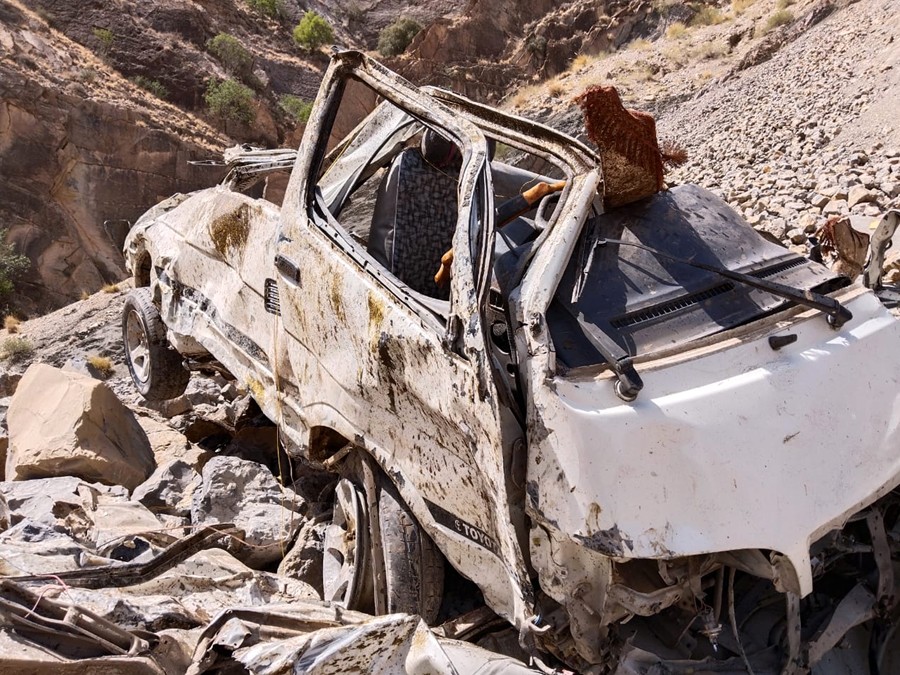 這是6月8日在巴基斯坦西南部俾路支省吉拉賽富拉地區(qū)拍攝的墜入山谷的汽車殘骸。