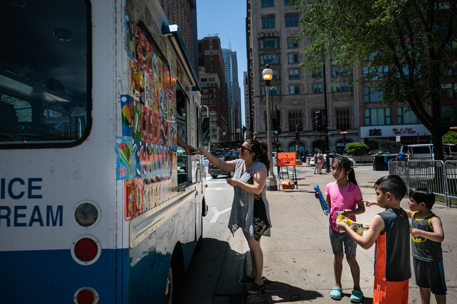 6月14日,在美國(guó)芝加哥,一名女子給孩子買冷飲。