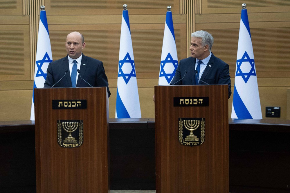 6月20日,以色列總理貝內(nèi)特(左)與候任總理、外長拉皮德在耶路撒冷共同發(fā)表講話。
