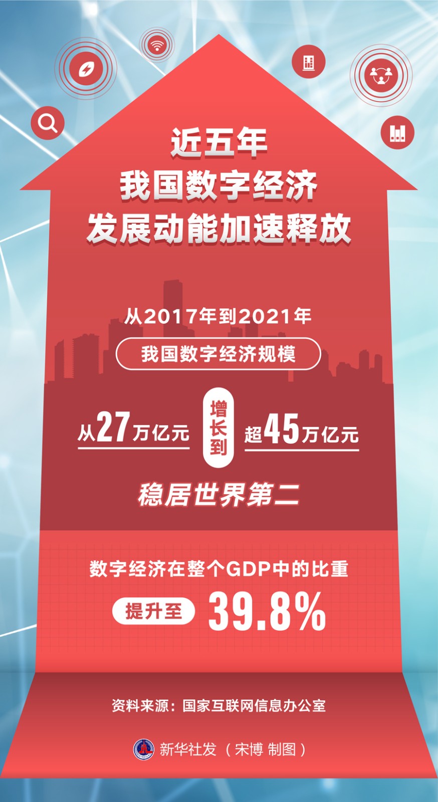 “從2017年到2021年,我國(guó)數(shù)字經(jīng)濟(jì)規(guī)模從27萬億元增長(zhǎng)到超45萬億元,穩(wěn)居世界第二。數(shù)字經(jīng)濟(jì)在整個(gè)GDP中的比重提升至39.8%?!眹?guó)家互聯(lián)網(wǎng)信息辦公室副主任曹淑敏7月5日在第五屆數(shù)字中國(guó)建設(shè)峰會(huì)新聞發(fā)布會(huì)上表示,黨的十九大以來,數(shù)字經(jīng)濟(jì)發(fā)展動(dòng)能加速釋放。